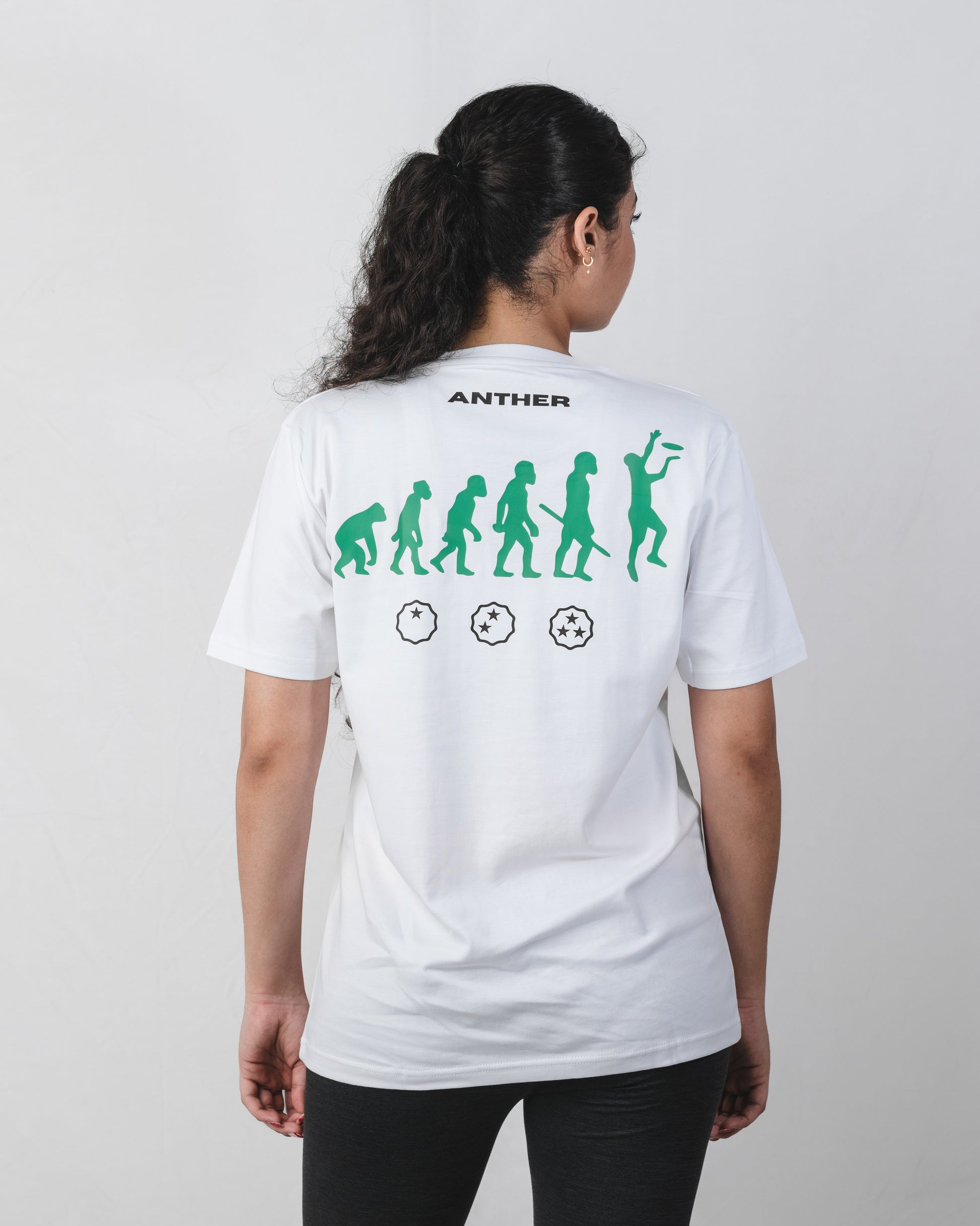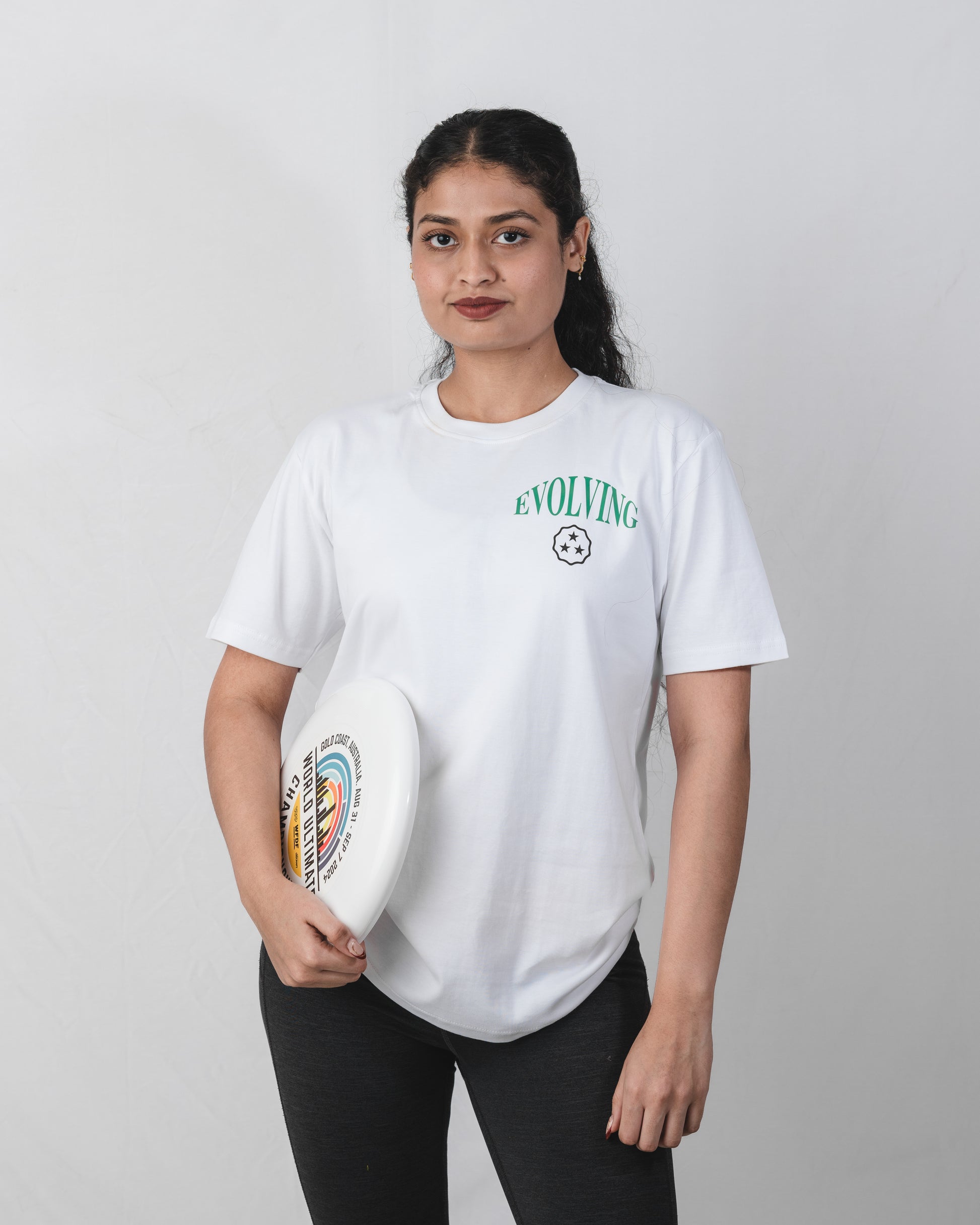 Elevate your ultimate frisbee game with the Ultimate Evolving tee. Made from 100% premium cotton, it's lightweight, breathable, and designed for peak performance. With a bold green design on clean white fabric, this tee delivers sharp style and comfort, game after game.